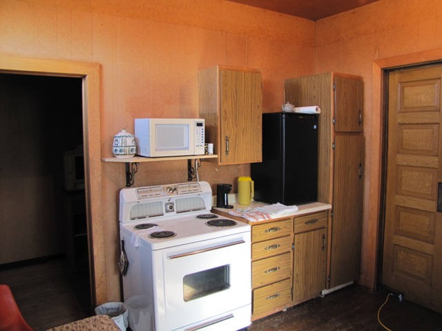 ...salvaged cabinets, and antique stove add a " homey " feeling..